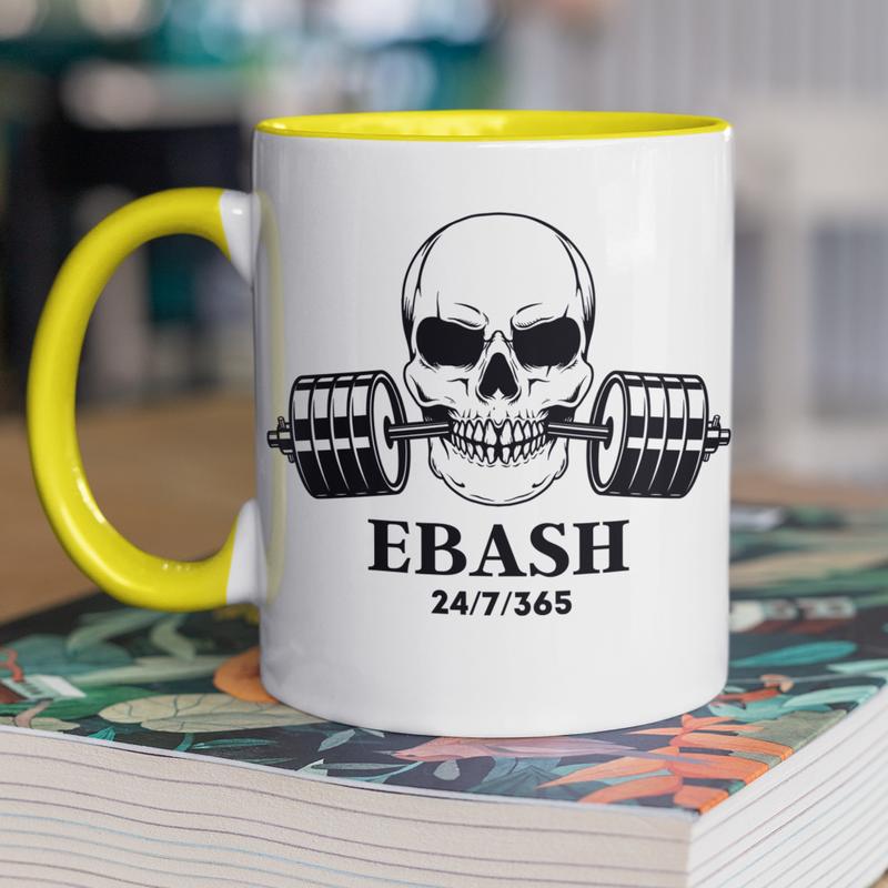 Чашка керамічна з принтом "ebash" 330 мл, біла з жовтою ручкою