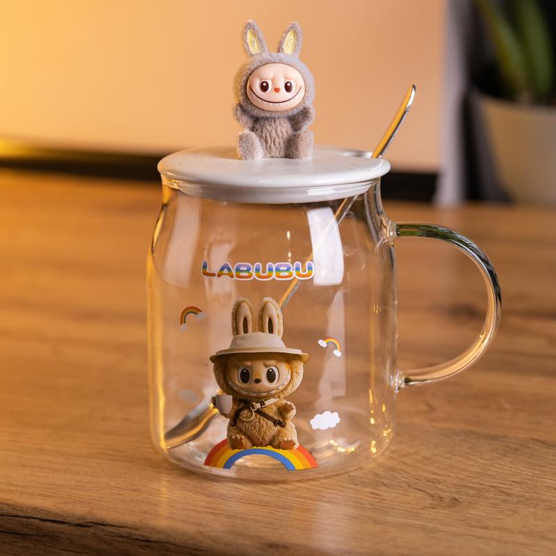 Стеклянная чашка labubu 600 мл с фарфоровой крышкой и ложкой, коричневая – стильный набор...