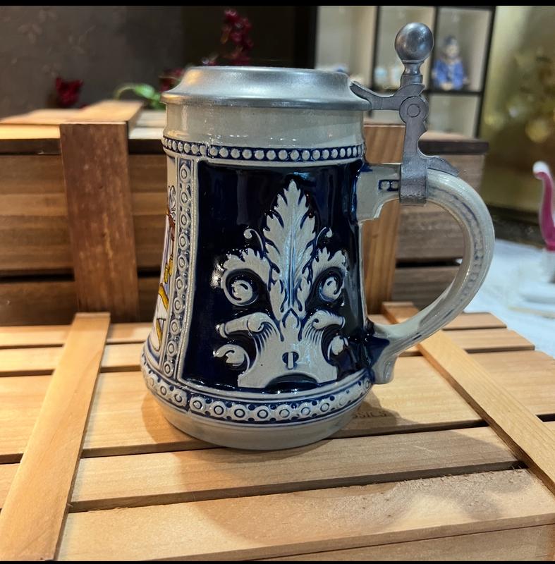 ⚜️ Пивная кружка с крышкой 🔱 Мануфактура — Gerzit (Gerz) 🔱 Страна - Германия 🔱 Описание - керамика с оловянной крышкой, глубокий кобальтовый фон, рельефный декор, клеймо Original Gerzit; состояние отличное 🔱 Высота - 16 см