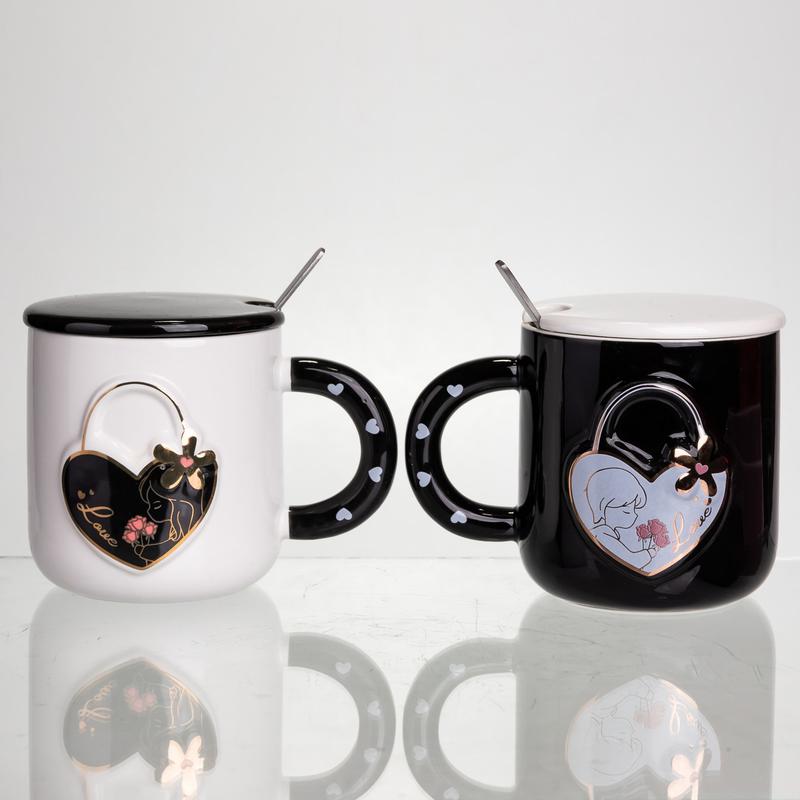 Набор парных фарфоровых чашек с сердцем 2 (шт) по 400 (мл) чашки на подарок с крышкой и ло...