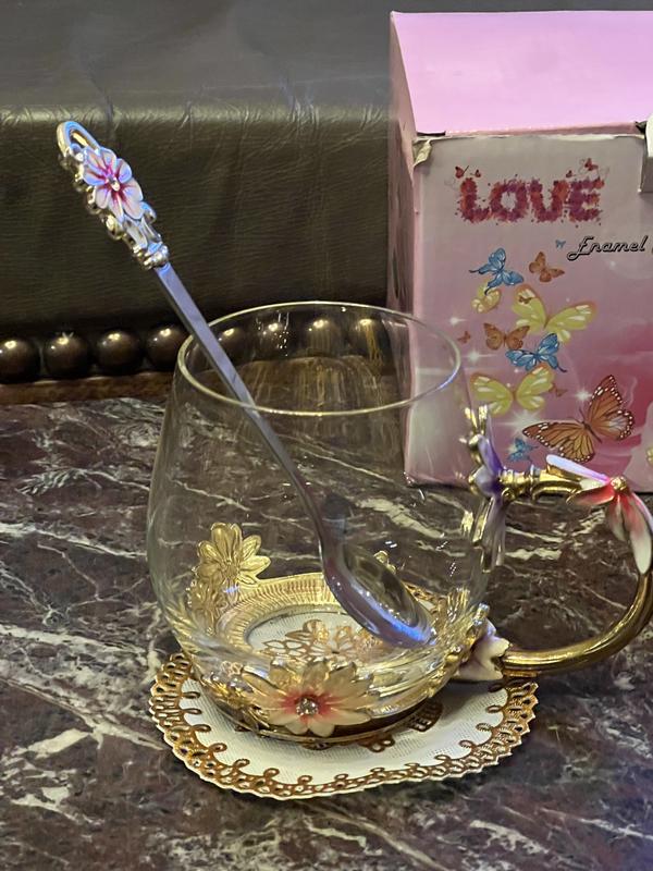Чайна чашка “LOVE” з емалевими квітами, 300 мл — подарунковий набір Стильна скляна чашка з декором (квіти/бабка) у золотистій оправі. У комплекті чашка 300 мл + ложечка + підставка (серветка) + коробка. Ідеально на подарунок, для дому/кафе, фотосервірування.