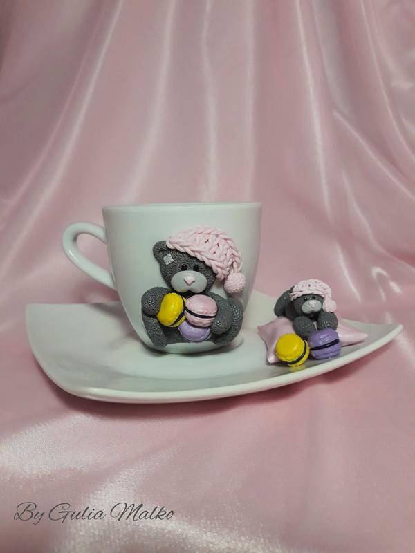 Чашка с блюдцем с декором из полимерной глины (мишки Тедди)