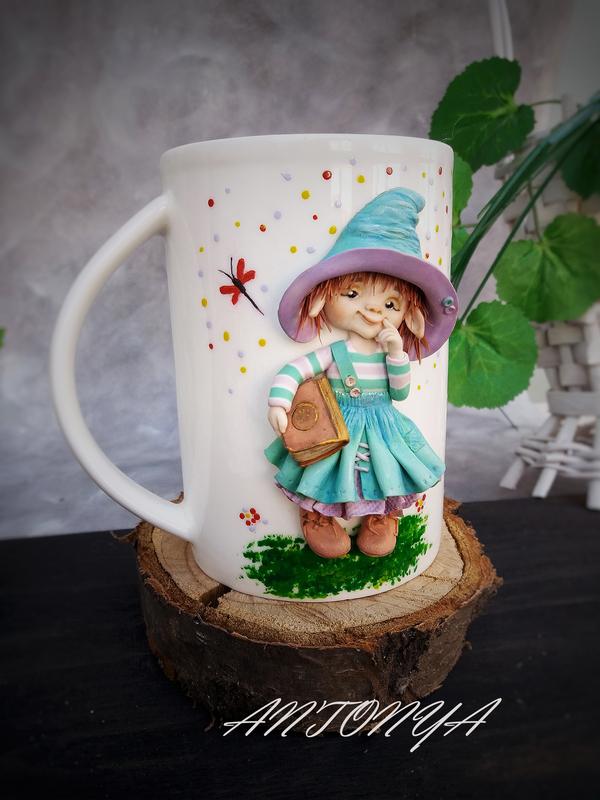 Оригинальный и необычный подарок, такого больше нет!!!! Декор на чашке выполнен из запекаемой полимерной глины, декор прочен и не боится воды. Чашку можно использовать по назначению, чашка моется мягкими моющими средствами. НЕ мыть в посудомоечной машине и не использовать для нагрева микроволновку. Объем чашки 410 мл., фарфор, производитель Wilmax Великобритания. Прекрасный подарок-чашка с декором Девочка эльф!