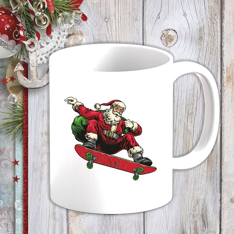 Белая кружка (чашка) с новогодним принтом дед мороз на скейте c мешком