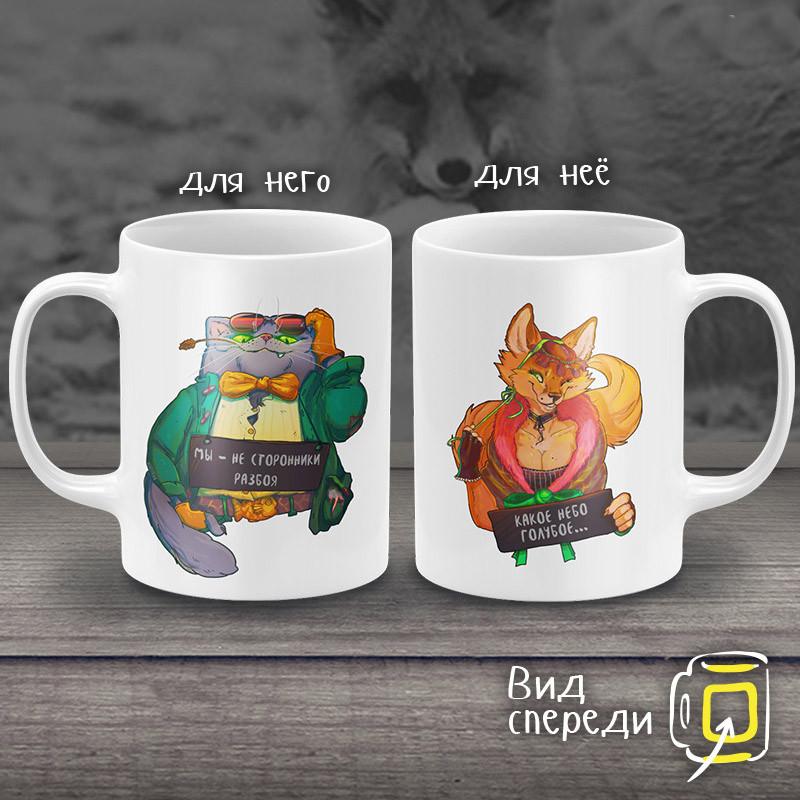 Парные белые чашки (кружки) с принтом "кот базилио и лиса алиса"