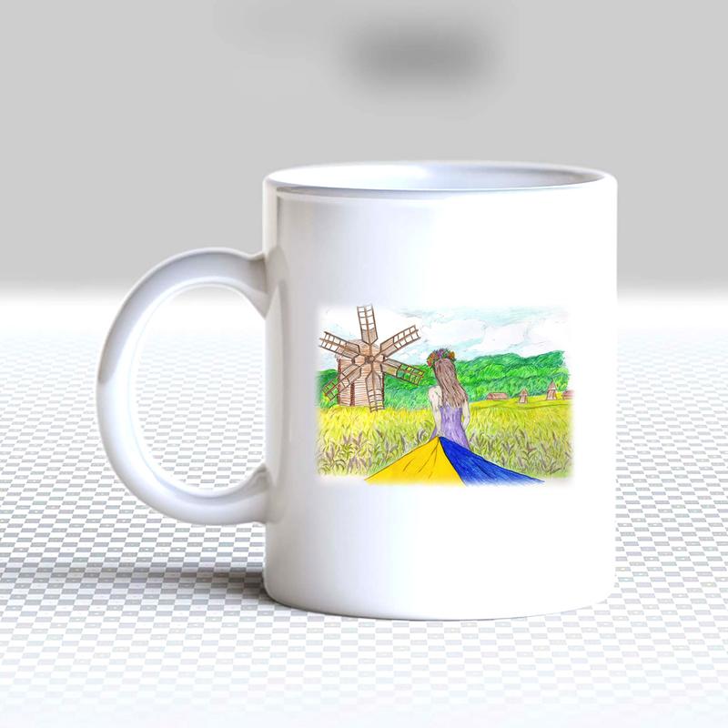ТРЕТЬ СУММЫ УЙДЕТ НА НУЖДЫ АРМИИ И ВОЛОНТЕРСКИХ ОРГАНИЗАЦИЙ Белая кружка (чашка) с принтом "Пейзаж с полем, девушкой и мельницей" Матеріал: кераміка класу преміум. Колір: білий. Нанесення: сублімаційний друк Об'єм: 320 мл Догляд: можна мити в посудомийних машинах, гріти в мікрохвильовці. Малюнок залишиться яскравим навіть після численних циклів миття.