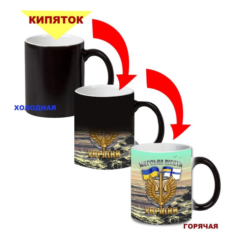 Кухоль змінює колір при нагріванні. У холодному стані, кухоль чорного кольору. Після того, як у кухоль наливається гаряча вода, вона стає білого кольору, на якому дуже добре видно принт. Після остигання кружки вона знову стає повністю чорною і знову приховує надрукований малюнок. Об'єм 330 мл.