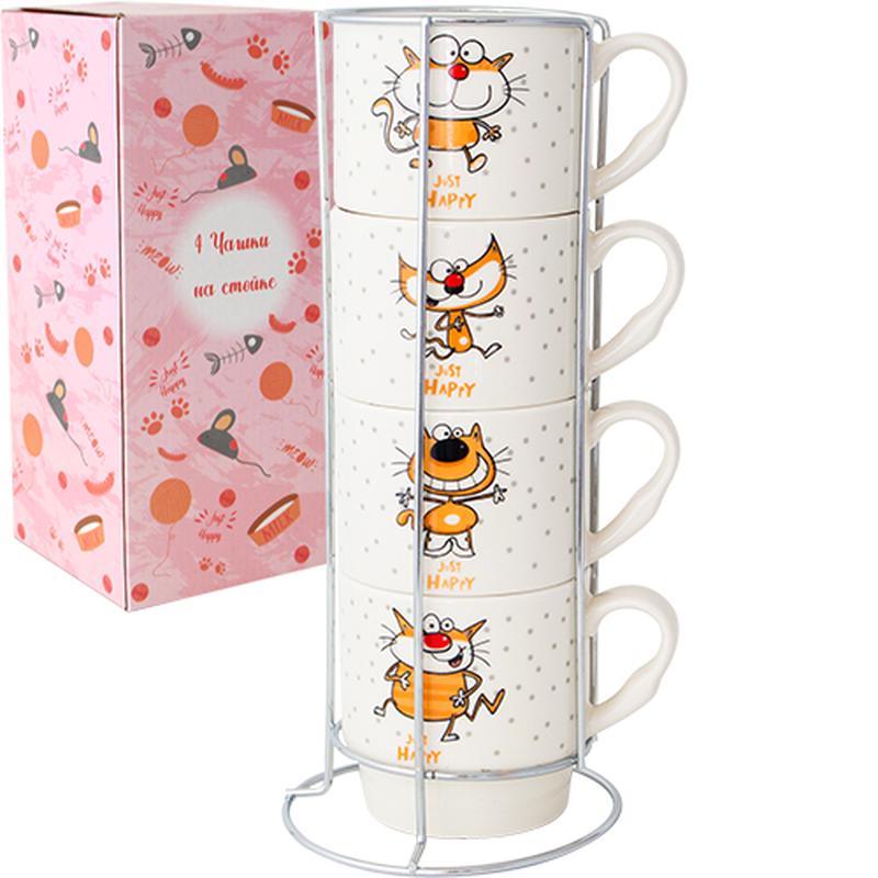 Набор 4 чашки на стойке Happy cat 320 мл, материал керамика. Отправка после 100% предоплаты.