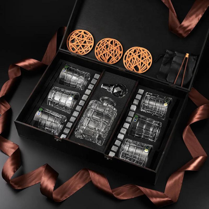 Индивидуальная гравировка - это возможность сделать Например: гербы, инициалы, обрамление, приветствие, эмоции 100% детали спрашивайте у менеджера *Выбрать макет из наших шаблонов можно по кнопке ниже. *Также в конце описания по кнопке "Обрати бажаний набір" можете ознакомиться с большим ассортиментом наборов. *напишите в комментариях к заказу, если вам нужна гравировка. Мы вам отпишем. Полное описание набора: - Черная коробка из натурального дерева: 51 см * 34 см * 14 см со стандартным гравированием WHISKY STONES на внешней стороне, перевязанная лентой; - Графин; - 6шт - бокалы; - 6шт - элегантные деревянные костеры под бокалы; - 24шт - стеатитовых камней для охлаждения виски; - Деревянные щипцы; - Кожаный мешочек для камешков; - Инстукция по использованию камешков. Самый большой ассортимент наборов и видов