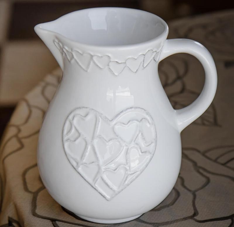 Кувшин "Сердца" - это посуда предназначена для сервировки стола, для подачи молока, сливок, компотов и их кратковременного хранения. Керамический, декорированный с рисунком посуда белого цвета с ручкой на боковой поверхности и носиком. Он позволяет аккуратно наливать сливки и молоко в кофе или чай. Его удобно держать в руке. Подходит как для повседневного использования, так и для сервировки праздничного стола. Данный предмет станет украшением любой кухни. фото 1 и 2 Ширина, 11 см Высота, 16 см Материал - керамика