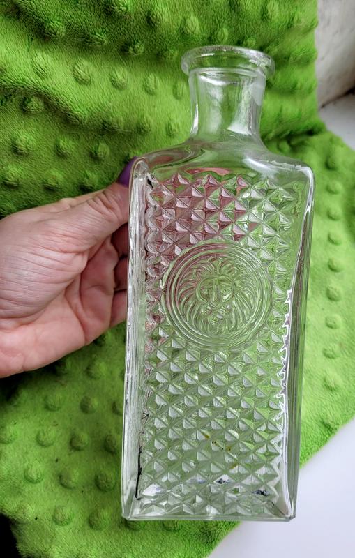 Хрустальный плоский графин с изображением головы мифического льва. Ширина - 7 см Толщина. - 5 см