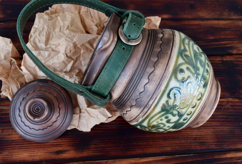 Керамічний глек зі шкіряною ручкою. Зручне інноваційне рішення. Об'єм 1.5 л. Виготовлений з білої глини на гончарному колі, серединка глазурована.