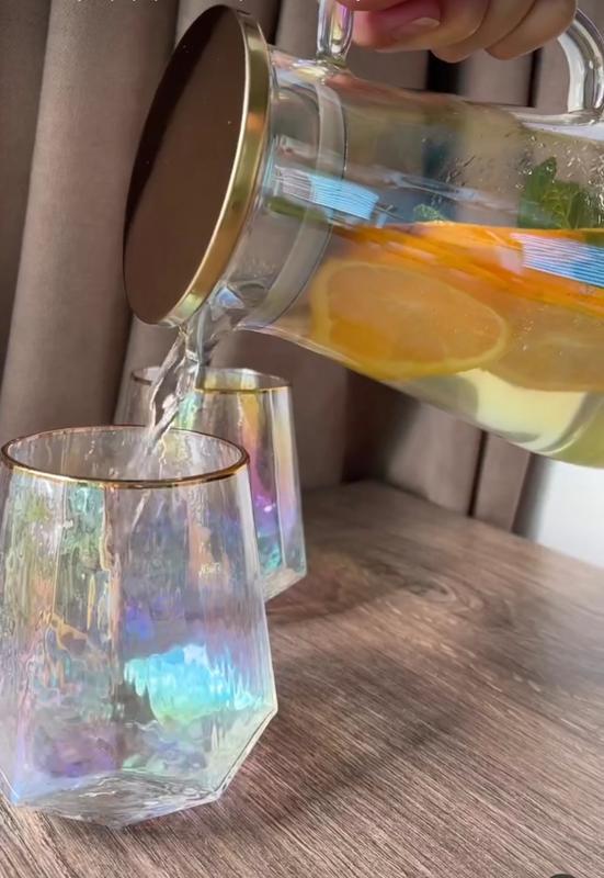 Це просто космічна колекція Якщо Ви хочете порадувати себе естетично привабливим та атмосферним посудом, яким хочеться користуватися із задоволенням, то це те, що Вам потрібно. Склянка мають рельєфну поверхню, яка крім того, що відрізняється ефектним зовнішнім виглядом, досить приємна на дотик. Обідок виконаний у розкішному золотистому кольорі. Тонка, витончена ніжка додає ще більшої невагомості. Дане скло дуже красиво переливається різними кольорами. Колекція "Перлина" Матеріал: скло Склянка (в наявності 2 шт, продаються парою) 500 мл - ціна за 1 шт. 310 грн Глечик скляний з кришкою 1600мл. Ціна 530 грн