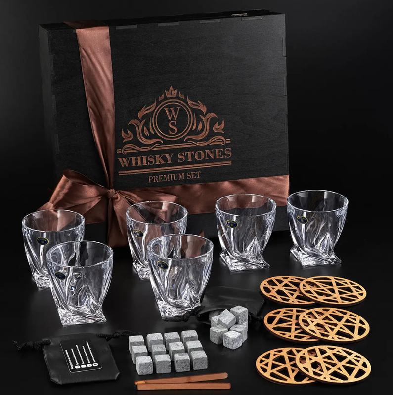 Идеальный подарок для мужчины который ценит изысканный вкус крепких напитков! Наши подарочные наборы бокалов с камнями для виски подойдут для истинных ценителей виски, которые хотят употреблять этот элитный напиток с максимальным удовольствие, так как для получения максимального вкусового букета употреблять виски необходимо температурой 18-20 градусов, с этими задачами идеально справятся наши наборы с камнями для виски которые не растают в Вашем изыскаком напитке. В подарочный набор входит: 1. Качественная деревянная подарочная упаковка 36 на 34 см на 11 см в темном дереве. Внутренняя часть - это мягкий ложемент (камни и бокалы всегда будут целые и красиво, престижно хранится) в котором лежат оригинальные камни для виски 24 шт, мешочек для камней из экокожи, щипцы и подставка под стакан. 2. Оригинальные американские Камни для охлаждения виски 24 шт. Камни предназначены для охлаждения виски, охлаждают и не разбавляют его как лед. Камни оригинал из США. 3. Мешочек из экокожи 2 шт. Наши мешочки для виски изготовлены из качественной экокожи, которая имитирует натуральную кожу, но не трескается от минусовой температуры. Также ни в коем случае не рекомендуем покупать наборы с мешочками из натуральной ткани - она натягивает посторонние запахи и вкусы из холодильника, также ворсинки затем попадают в виски. 4. Стильный бокал для виски 6 шт. 5. Деревянные щипцы, которые в отличии от металлических не поцарапают и не повредят камень. 6. Деревянная подставка под стаканы, чтоб не царапать стол и стаканы. Сделайте ваш подарок особенным! Выполняем индивидуальные заказы - гравировку на стаканах и деревянных коробках! Наносим любой Ваш логотип, или выбирайте среди готовых в фото товара Краткая информация о наших наборах: Оригинальные камни из стеатита Наши камни для виски произведены из оригинального стеатита (талькохлорита) из США. Вы можете убедится об этом на нашем сертифицированном геммологическом заключении. Наши камни идеально ровной формы, перед отправкой заказа мы проверяем каждый камень в коробке на наличие даже малейших сколов. Обратите внимание, мы на рынке с 2016 года, можете проверите по дате на нашем сертификате. Качественная деревянная упаковка Наша коробка из качественного дерева, идеально отполирована. Мы гарантируем, что на упаковке не будет никаких изъянов и сучков. Качественная деревянная подарочная упаковка в темном дереве. Внутренняя часть - это мягкий ложемент (камни и бокалы всегда будут целые, красиво и престижно храниться) в котором лежат оригинальные камни для виски, мешочек для камней из экокожи, бокал на выбор, щипцы и подставка под бокалы. Коробка с бантом Ваш подарок будет уже перевязан красивым атласным бантом и готов к подарку. Мы качественно упакуем отправление, чтоб ваш заказ доехал без повреждений. Мягкий ложемент Только у нас все наполнение хранится в мягком черном ложементе. Каждая позиция, камни, стаканы, щипцы, подставки, мешочек находится в отдельной секции и надежно фиксируются, они будут всегда надежно хранится не повреждая друг-друга. Так же ложемент выглядит очень престижно. Мешочек из экокожи. Это важно! Производитель использует мешочек из экокожи, внешне его структура как натуральная кожа, а с внутренней стороны специальная нейлоновая сеточка для дополнительной прочности. Кожа не используется, так-как он