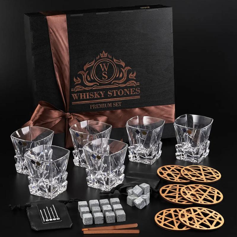 Идеальный подарок для мужчины который ценит изысканный вкус крепких напитков! Наши подарочные наборы бокалов с камнями для виски подойдут для истинных ценителей виски, которые хотят употреблять этот элитный напиток с максимальным удовольствие, так как для получения максимального вкусового букета употреблять виски необходимо температурой 18-20 градусов, с этими задачами идеально справятся наши наборы с камнями для виски которые не растают в Вашем изыскаком напитке. В подарочный набор входит: 1. Качественная деревянная подарочная упаковка 36 на 34 см на 11 см в темном дереве. Внутренняя часть - это мягкий ложемент (камни и бокалы всегда будут целые и красиво, престижно хранится) в котором лежат оригинальные камни для виски 24 шт, мешочек для камней из экокожи, щипцы и подставка под стакан. 2. Оригинальные американские Камни для охлаждения виски 24 шт. Камни предназначены для охлаждения виски, охлаждают и не разбавляют его как лед. Камни оригинал из США. 3. Мешочек из экокожи 2 шт. Наши мешочки для виски изготовлены из качественной экокожи, которая имитирует натуральную кожу, но не трескается от минусовой температуры. Также ни в коем случае не рекомендуем покупать наборы с мешочками из натуральной ткани - она натягивает посторонние запахи и вкусы из холодильника, также ворсинки затем попадают в виски. 4. Стильный бокал для виски 6 шт. 5. Деревянные щипцы, которые в отличии от металлических не поцарапают и не повредят камень. 6. Деревянная подставка под стаканы, чтоб не царапать стол и стаканы. Сделайте ваш подарок особенным! Выполняем индивидуальные заказы - гравировку на стаканах и деревянных коробках! Наносим любой Ваш логотип, или выбирайте среди готовых в фото товара Краткая информация о наших наборах: Оригинальные камни из стеатита Наши камни для виски произведены из оригинального стеатита (талькохлорита) из США. Вы можете убедится об этом на нашем сертифицированном геммологическом заключении. Наши камни идеально ровной формы, перед отправкой заказа мы проверяем каждый камень в коробке на наличие даже малейших сколов. Обратите внимание, мы на рынке с 2016 года, можете проверите по дате на нашем сертификате. Качественная деревянная упаковка Наша коробка из качественного дерева, идеально отполирована. Мы гарантируем, что на упаковке не будет никаких изъянов и сучков. Качественная деревянная подарочная упаковка в темном дереве. Внутренняя часть - это мягкий ложемент (камни и бокалы всегда будут целые, красиво и престижно храниться) в котором лежат оригинальные камни для виски, мешочек для камней из экокожи, бокал на выбор, щипцы и подставка под бокалы. Коробка с бантом Ваш подарок будет уже перевязан красивым атласным бантом и готов к подарку. Мы качественно упакуем отправление, чтоб ваш заказ доехал без повреждений. Мягкий ложемент Только у нас все наполнение хранится в мягком черном ложементе. Каждая позиция, камни, стаканы, щипцы, подставки, мешочек находится в отдельной секции и надежно фиксируются, они будут всегда надежно хранится не повреждая друг-друга. Так же ложемент выглядит очень престижно. Мешочек из экокожи. Это важно! Производитель использует мешочек из экокожи, внешне его структура как натуральная кожа, а с внутренней стороны специальная нейлоновая сеточка для дополнительной прочности. Кожа не используется, так-как он