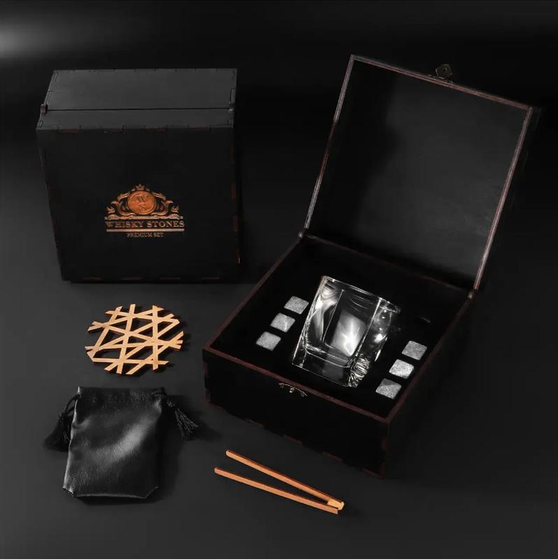 Идеальный подарок для мужчины который ценит изысканный вкус крепких напитков! Наши подарочные наборы бокалов с камнями для виски подойдут для истинных ценителей виски, которые хотят употреблять этот элитный напиток с максимальным удовольствие, так как для получения максимального вкусового букета употреблять виски необходимо температурой 18-20 градусов, с этими задачами идеально справятся наши наборы с камнями для виски которые не растают в Вашем изыскаком напитке. В подарочный набор входит: 1. Качественная деревянная подарочная упаковка 20 на 20 см на 11 см в темном дереве. Внутренняя часть - это мягкий ложемент (камни и бокалы всегда будут целые и красиво, престижно хранится) в котором лежат оригинальные камни для виски 6 шт, мешочек для камней из экокожи, щипцы и подставка под стакан. 2. Оригинальные американские Камни для охлаждения виски 6 шт. Камни предназначены для охлаждения виски, охлаждают и не разбавляют его как лед. Камни оригинал из США. 3. Мешочек из экокожи. Наши мешочки для виски изготовлены из качественной экокожи, которая имитирует натуральную кожу, но не трескается от минусовой температуры. Также ни в коем случае не рекомендуем покупать наборы с мешочками из натуральной ткани - она натягивает посторонние запахи и вкусы из холодильника, также ворсинки затем попадают в виски. 4. Стильный бокал для виски. 5. Деревянные щипцы, которые в отличии от металлических не поцарапают и не повредят камень. 6. Деревянная подставка под стаканы, чтоб не царапать стол и стаканы. Сделайте ваш подарок особенным! Выполняем индивидуальные заказы - гравировку на стаканах и деревянных коробках! Наносим любой Ваш логотип, или выбирайте среди готовых в фото товара Краткая информация о наших наборах: Оригинальные камни из стеатита Наши камни для виски произведены из оригинального стеатита (талькохлорита) из США. Вы можете убедится об этом на нашем сертифицированном геммологическом заключении. Наши камни идеально ровной формы, перед отправкой заказа мы проверяем каждый камень в коробке на наличие даже малейших сколов. Обратите внимание, мы на рынке с 2016 года, можете проверите по дате на нашем сертификате. Качественная деревянная упаковка Наша коробка из качественного дерева, идеально отполирована. Мы гарантируем, что на упаковке не будет никаких изъянов и сучков. Качественная деревянная подарочная упаковка 20 на 20 см на 11 см в темном дереве. Внутренняя часть - это мягкий ложемент (камни и бокалы всегда будут целые, красиво и престижно храниться) в котором лежат оригинальные камни для виски 6 шт, мешочек для камней из экокожи, бокал на выбор, щипцы и подставка под бокалы. Коробка с бантом Ваш подарок будет уже перевязан красивым атласным бантом и готов к подарку. Мы качественно упакуем отправление, чтоб ваш заказ доехал без повреждений. Мягкий ложемент Только у нас все наполнение хранится в мягком черном ложементе. Каждая позиция, камни, стаканы, щипцы, подставки, мешочек находится в отдельной секции и надежно фиксируются, они будут всегда надежно хранится не повреждая друг-друга. Так же ложемент выглядит очень престижно. Мешочек из экокожи. Это важно! Производитель использует мешочек из экокожи, внешне его структура как натуральная кожа, а с внутренней стороны специальная нейлоновая сеточка для дополнительной прочности. Кожа не используется,