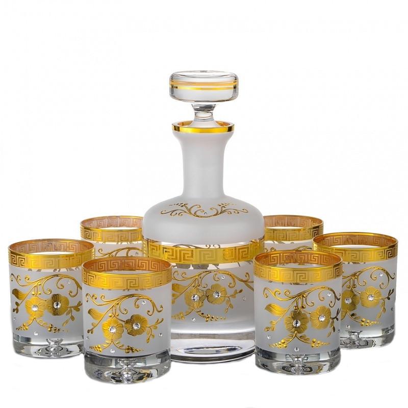 Набір для віскі з серії Імпарі ТМ LORA – чудовий подарунок для вашого начальника або бізнес-партнера. Цей брендовий презент відмінно підійде як подарунок до дня народження або будь-якого іншого свята. Богемське скло, прикрашене золотистим візерунком і кристалами, додасть будь-якому інтер'єру вишуканість і шарм. Набір для віскі Імпарі складається з шести келихів і графина. Форма і скло келихів для віскі дає можливість оцінити колір і прозорість цього благородного напою, а те, наскільки він прозорий, свідчить про якість перегонки віскі. Існують рекомендації правильної подачі віскі на стіл. Потрібно подавати віскі, лід і воду в окремому посуді, щоб напій можна було розбавити самостійно, кожен міг зробити це на свій смак. Набір потрібно мити вручну з мийним засобом, не використовувати абразивних порошків і паст, які можуть залишити на поверхні подряпини. Висота графина – 26,6 см, діаметр – 12 см.
