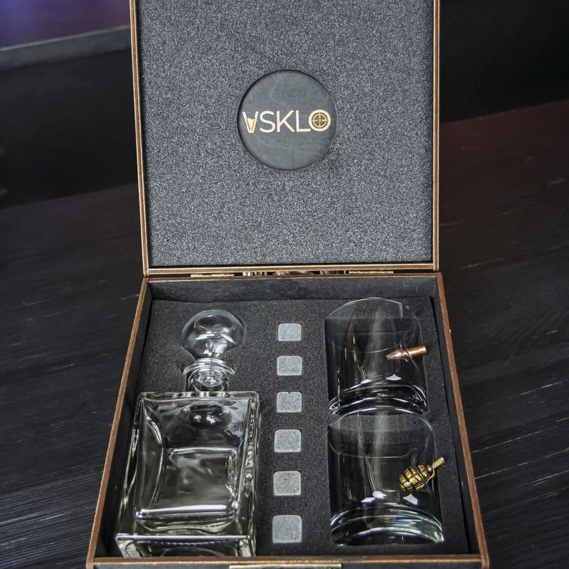 Vip набор mix графин с гербом, 2 стакана с пулей, лимонкой и камни + деревянная коробка