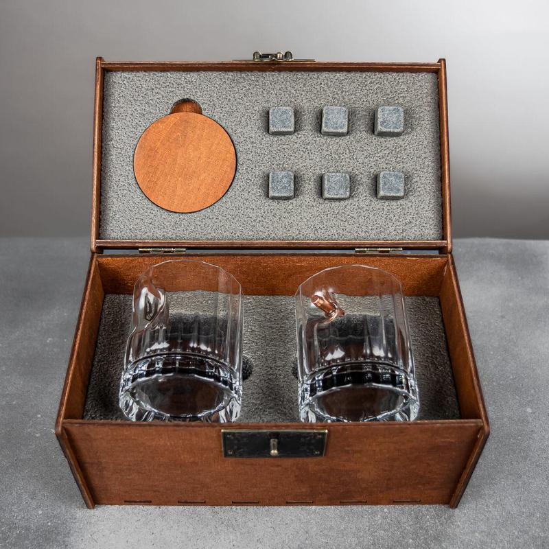Премиальный набор камней для виски + пара стаканов граненый хрусталь с пулею, гербом + дер...