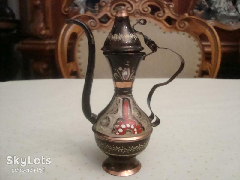 КРАСИВЫЙ КОЛЛЕКЦИОННЫЙ МИНИ КУВШИН КОФЕЙНИК МЕТАЛЛ ЧЕКАНКА ЭМАЛЬ СОСТОЯНИЕ И РАЗМЕРЫ НА ФОТО ВЫСОТА 12.5 СМ.