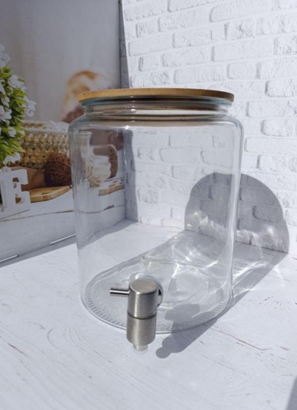 Емкость (банка) для лимонада, сока, вина, освежающих напитков с фруктами и цитрусовыми. Объем 5 л. Комплектуется лимонадник крышкой с защелками и краном для удобного использования. Таким графином смогут пользоваться даже дети, не подводя тяжелый графин с напитком. Материал графина – Стекло. Стеклянная емкость полностью безопасна и не подвержена воздействию кислот и щелочей, поэтому отлично подойдет для длительного хранения напитков. Кувшин для напитков с краником (лимонадник) станет достойным украшением любого праздника, его можно взять на природу и дачу, а также наслаждаться каждый день дома любимыми напитками.