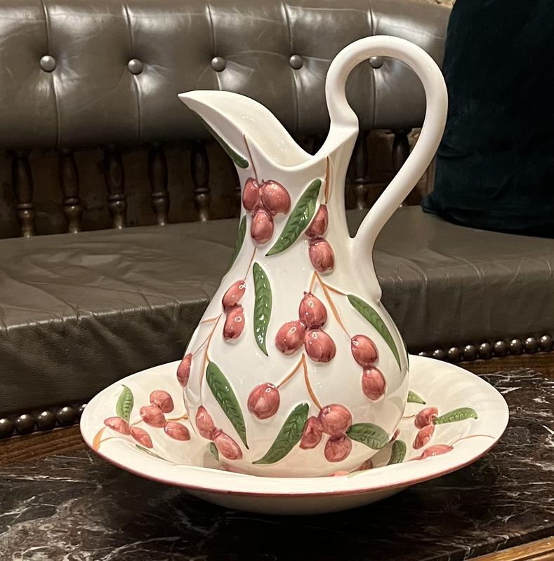 Керамический набор: кушин и блюдо «Вишни», ручная роспись Это волшебный комплект из керамики: большой кучин и глубокое блюдо, оба украшены изящной ручной росписью с мотивами спелых ягод и зеленых листьев. Кушин имеет удобную, элегантно изогнутую ручку и горловину, создающую образ нежности и практичности при этом. Блюдо, выполненное в том же стиле, служит отличной подставкой или блюдом для подачи. Идеально подходит для сервировки компотов, воды, морсов или как декоративная вещь в стиле прованс, рустик или этно. 📏 Размеры: Кувшин Высота 32 см Объем 2 л 400 мл Блюдо Диаметр 31 см высота 6 см