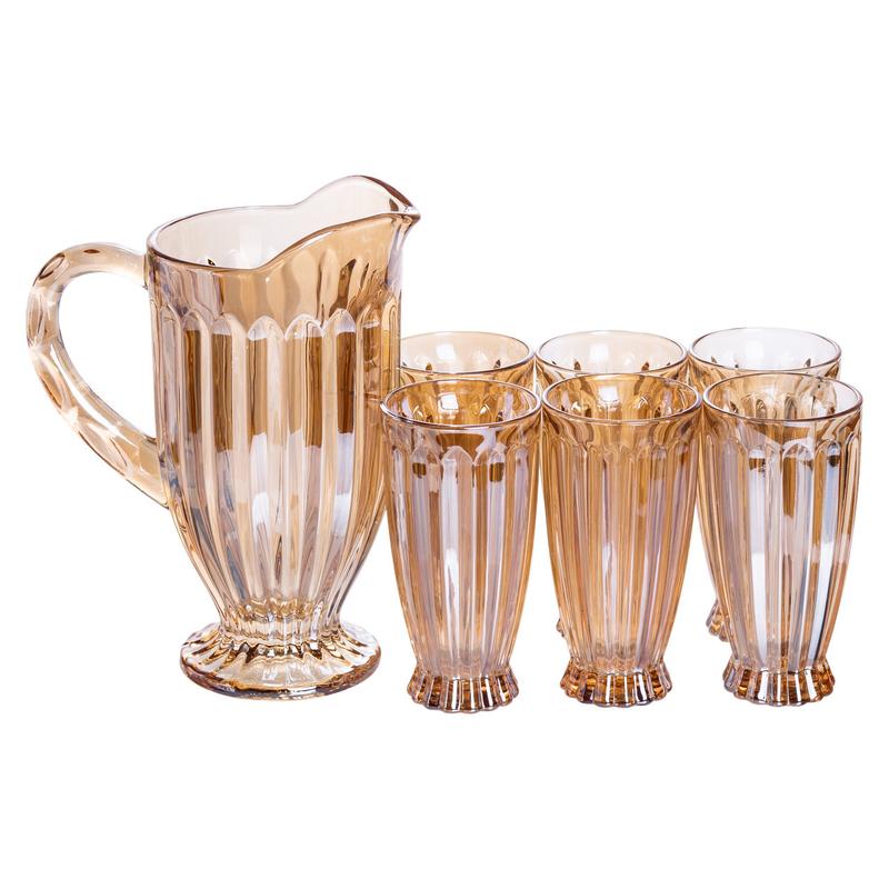 Этот элегантный набор состоит из одного кувшина и шести стаканов, выполненных в едином стиле из прозрачного стекла. Вертикальное рифление придаёт предметам текстуру, делает форму более выразительной и обеспечивает надёжный захват -- даже мокрыми руками посуда не скользит. Характеристики набора кувшина со стаканами: Материал: стекло; Размеры кувшина: диаметр - 12 см, высота - 23 см; Размеры стаканов: диаметр - 7.5 см, высота - 14.5 см; Объем кувшина: 1 л; Объем стаканов: 300 мл; Назначение: для подачи воды, сока, лимонада и других напитков; Уход: подходит для посудомоечной машины. Преимущества набора для напитков: Практичность -- подходит для ежедневного интенсивного использования в кафе и ресторанах. Комплексная подача -- кувшин и стаканы в одном стиле создают единую сервировочную линию. Прочный материал -- стекло устойчиво к царапинам и легко моется. Рельефная форма -- удобная для удержания, не скользит в руке. Презентабельный внешний вид -- подчёркивает чистоту и эстетику подачи напитков. Сферы применения HoReCa: рестораны, кафе, бары, гостиницы; кейтеринг и обслуживание банкетов; офисные кухни и переговорные; домашние застолья, фуршеты и праздничные мероприятия. Этот набор станет практичным решением для дома, дачи, офиса или кафе. Стильный, удобный и функциональный, он идеально подойдёт для подачи напитков в любой обстановке.