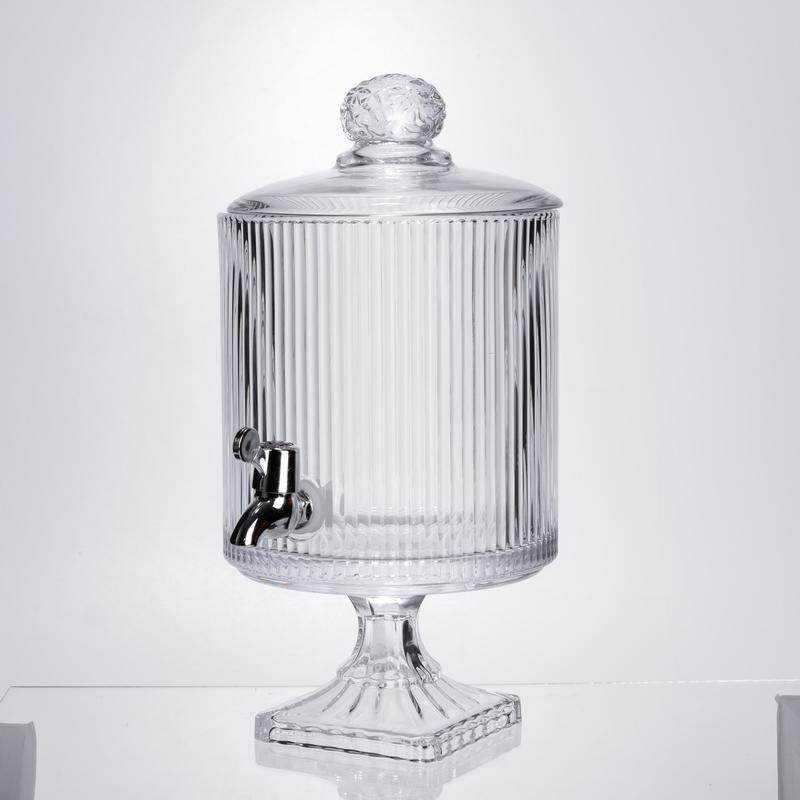 Элегантная лимонадница из прочного стекла идеально подойдёт для подачи прохладительных напитков на праздничном столе, фуршете или в повседневной обстановке. Прозрачные стенки с вертикальным рифлением придают изделию изысканный вид, а кран обеспечивает удобное наливание напитков. Основные характеристики: Объём: 4.5 л; Высота: 39 см; Материал: стекло; Верхний диаметр : 20 см. Особенности: Прочное и толстое стекло, устойчивое к царапинам; Рельефный дизайн придаёт праздничный и винтажный стиль; Удобный кран для дозированной подачи напитка; Устойчивое основание на ножке; Крышка плотно закрывается, защищая напиток от загрязнений и насекомых. Эта стильная лимонадница станет не только удобным аксессуаром на кухне или столе, но и изысканным элементом сервировки. Идеально подойдёт для подачи напитков летом, на праздниках, вечеринках или просто для ежедневного использования дома или в офисе. Удобство, вместительность и красивый дизайн делают её отличным выбором для каждого дома.