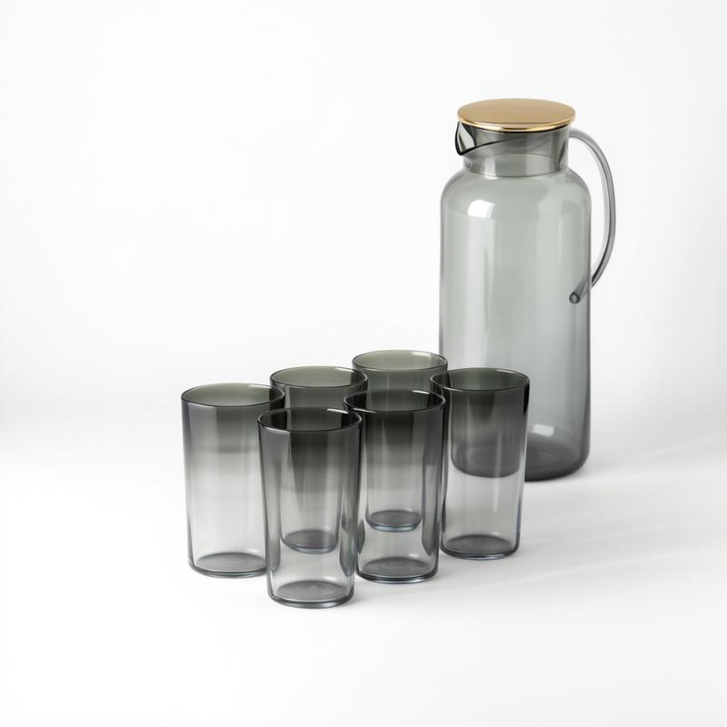Этот стильный набор посуды цвета "графит" станет элегантной деталью вашего ежедневного или праздничного стола. Лаконичный дизайн, гладкое дымчатое стекло и современные формы идеально подходят для красивой подачи прохладительных напитков: воды со льдом, соков, домашних лимонадов или компотов. Центральный элемент набора - кувшин объемом 1,5 литра. Он оснащен большой удобной ручкой и аккуратным носиком, позволяющим разливать напитки, не проливая ни капли. Горловина закрывает стильная плоская крышка (золотистого цвета), которая не только защищает содержимое от пыли, но и придает изделию завершенный вид. В комплект входят 6 одинаковых стаканов. Благодаря полупрозрачному темному оттенку стекла, набор выглядит дорого и изысканно, гармонично вписываясь в интерьеры стиля лофт, хай-тек или минимализм. Характеристики питьевого набора и кувшина со стаканами: Тип изделия: набор для воды и напитков; Материал: стекло; Цвет: графит (полупрозрачный серый); Количество предметов в наборе: 7 штук; Объем кувшина: 1,5 л (1500 мл); Объем стаканов: 120 мл; Особенности: кувшин с крышкой и ручкой, утолщенное дно; Назначение: для безалкогольных напитков, воды, сока. Комплектация: Кувшин с крышкой - 1 шт Склянки -- 6 шт.