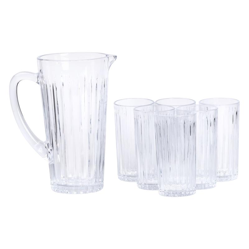 Набор для напитков состоит из одного кувшина и шести стаканов, изготовленных из прозрачного стекла. Все элементы имеют рельефную (ребристую) внешнюю поверхность, что обеспечивает надежный захват и снижает риск случайного выскальзывания из рук. Стеклянный материал устойчив к изменению температур и не впитывает запахов, что делает набор пригодным для ежедневного использования с холодными или комнатной температуры напитками. Характеристики набора стаканов с кувшином высота кувшина: 23 см; диаметр кувшина: верх - 12 см, низ - 8.5 см; высота стаканов: 13.5 см; диаметр стаканов: верх - 7 см, низ - 6 см; объем кувшина: 1.2 л; объем стаканов: 320 мл; материал: стекло; количество предметов: 7 (6 стаканов + 1 кувшин). Кувшин имеет эргономичную ручку и носик для комфортного наливания жидкости, объем позволяет удобно сервировать напитки для семьи или гостей. Стаканы имеют классическую цилиндрическую форму, достаточную вместимость для порционного использования, а также толстые стенки для повышенной прочности. Все части набора легко очищаются вручную или в посудомоечной машине. Этот комплект подходит для подачи воды, компота, лимонада, сока и других безалкогольных напитков как в домашних условиях, так и в заведениях питания. Благодаря простому дизайну из прозрачного стекла набор гармонично вписывается в любой интерьер кухни или сервировки стола.