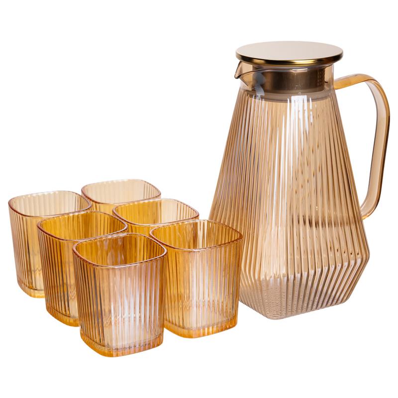 Элегантный набор для напитков включает графин и шесть стаканов, выполненных из прочного рифлёного стекла в благородном янтарном оттенке. Идеально подходит для подачи воды, сока, лимонада или холодного чая. Графин имеет удобную форму с эргономичной ручкой и металлической крышкой, которая защищает напиток от пыли и льда при наливании. Объём оптимален для семейного ужина, праздничного стола или сервировки офиса. Лаконичный и универсальный дизайн делает набор отличным дополнением к любой посуде. Он будет уместен и в повседневной сервировке, и на праздничном столе. Практичный и эстетичный, этот набор подойдёт как для дома, так и в качестве подарка. Характеристики набора стаканов с кувшином Размер кувшина: 15×12×23 см; Размер стаканов: 7×7×8 см; Объем кувшина: 1.8 л; Объем стаканов: 200 мл; Материал: стекло; Количество предметов: 7 (6 стаканов + 1 кувшин). Создайте атмосферу уюта и изысканности с этим стильным набором из стекла. Он станет украшением вашего стола и прекрасным подарком для ценителей красивой посуды.