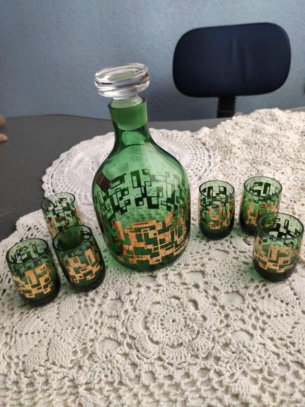 BOHEMIAN, ручная работа.Высота графина 18см,,рюмок5,5.Куплен в 80 годах,без сколов и трещин.От долгого хранения в тесной коробке есть потёртости на золотом рисунке.