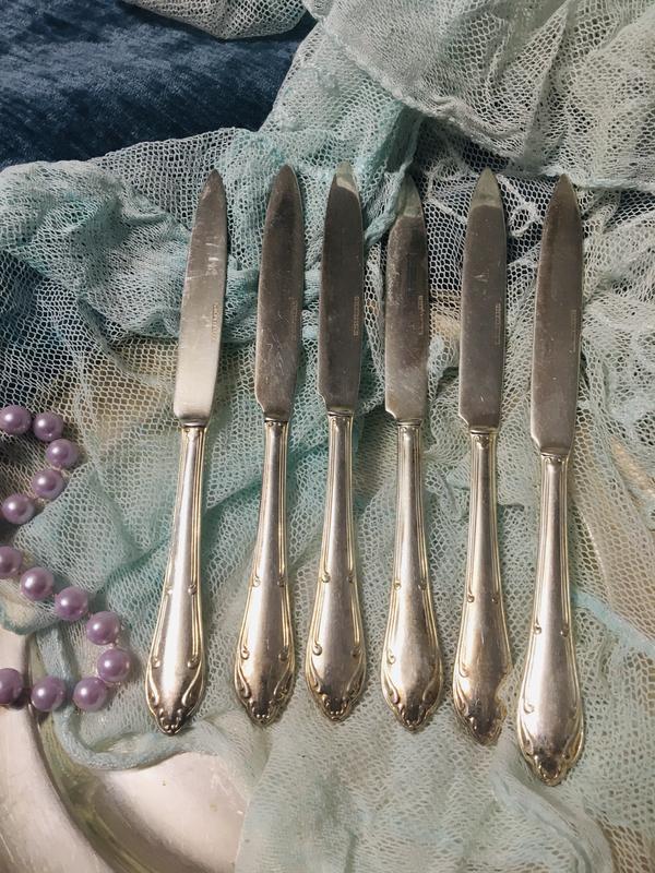🔥Чудовий🔥 набір десертних старовинних ножів у гарному стані. Швеція. Клеймо. Мельхіор у глибокому посріблені. Красиві та стильні прибори до Вашого столу. З чудовими фігурними ручками. Довжина - 16 см. Ціна вказана за один ніж. Можна поштучно. В наявності є такі ж ложки.