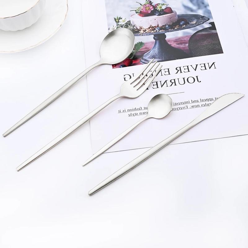 Класичний набір столових приладів: вилка 6 шт., ложка 6 шт., чайна ложка 6 шт., ножі 6 шт., у чорному, золотому та срібному кольорах. Набір виконаний із традиційної харчової нержавіючої сталі з покриттям. Саме вакуумне напилення визначає колір приладів, надає їм дорогоцінного блиску. Ергономічні ручки приладів зручно ляжуть в руку та не викличуть дискомфорту при використанні. Прилади досить важкі та якісні. Покриття надає приладам додаткової міцності: воно дуже стійке до окислення та механічних пошкоджень, так що столові прилади можна мити в посудомийній машині. При цьому покриття не має мікротріщин, в яких можуть жити мікроби та бактерії. Відсутність швів та нерівностей, особливо у місцях з'єднань, продовжать термін служби приладів. Оскільки сам процес вакуумного напилення металів не передбачає жодних хімічних реакцій, таке покриття абсолютно нешкідливе і не зіпсує їжу додатковими присмаками. Випукла частина ложок добре відполірована і, незважаючи на незвичайну форму, зручна та глибока. Тому вміст ложки не розплющується. Товсті зубці виделки досить гострі, щоб наколювати їжу. А гостре лезо ножа доповнено зубчиками, і вам не доведеться прикладати багато зусиль, щоб розрізати навіть не дуже вдалий стейк.