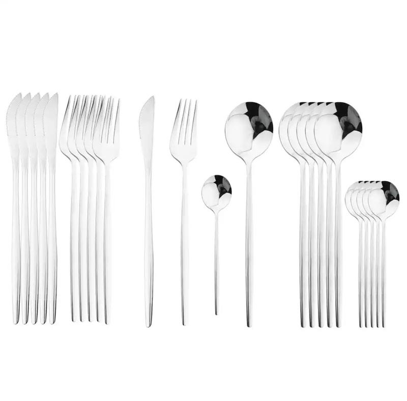 Класичний набір столових приладів: вилка 6 шт., ложка 6 шт., чайна ложка 6 шт., ножі 6 шт., у чорному, золотому та срібному кольорах. Набір виконаний із традиційної харчової нержавіючої сталі з покриттям. Саме вакуумне напилення визначає колір приладів, надає їм дорогоцінного блиску. Ергономічні ручки приладів зручно ляжуть в руку та не викличуть дискомфорту при використанні. Прилади досить важкі та якісні. Покриття надає приладам додаткової міцності: воно дуже стійке до окислення та механічних пошкоджень, так що столові прилади можна мити в посудомийній машині. При цьому покриття не має мікротріщин, в яких можуть жити мікроби та бактерії. Відсутність швів та нерівностей, особливо у місцях з'єднань, продовжать термін служби приладів. Оскільки сам процес вакуумного напилення металів не передбачає жодних хімічних реакцій, таке покриття абсолютно нешкідливе і не зіпсує їжу додатковими присмаками. Випукла частина ложок добре відполірована і, незважаючи на незвичайну форму, зручна та глибока. Тому вміст ложки не розплющується. Товсті зубці виделки досить гострі, щоб наколювати їжу. А гостре лезо ножа доповнено зубчиками, і вам не доведеться прикладати багато зусиль, щоб розрізати навіть не дуже вдалий стейк.