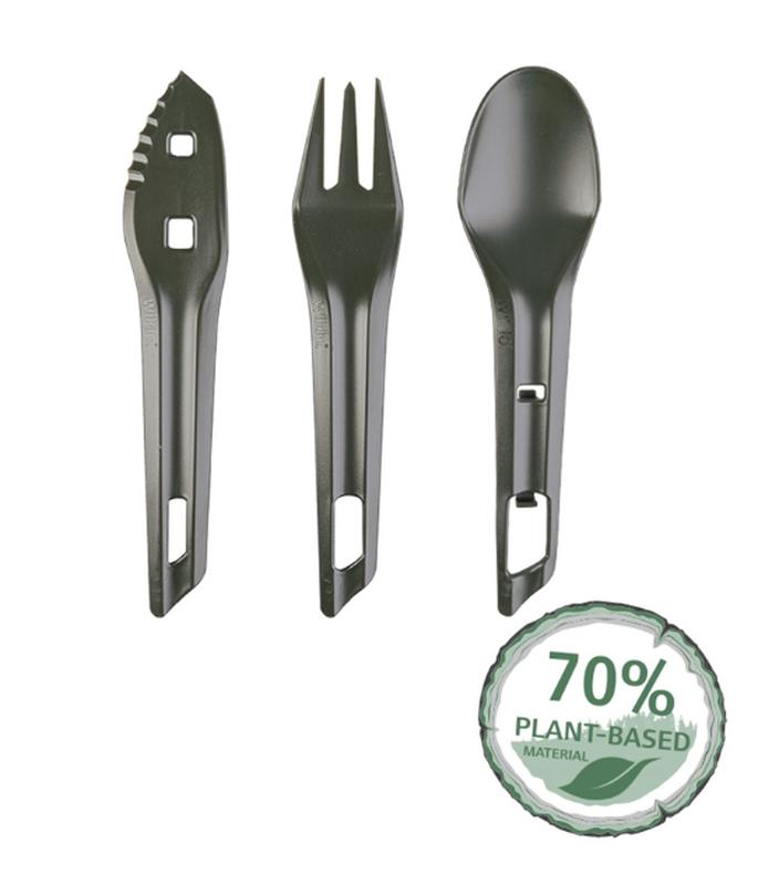 Матеріал: PA. Довжина: 17,5 см. Вага: 31г Набір столових приборів Wildo THE OCYs на 70% складається з рослинного матеріалу Зроблено в Швеції Осоливості: - гострий ніж, зручна виделка і висувна ложка (в поєднанні з ножем).