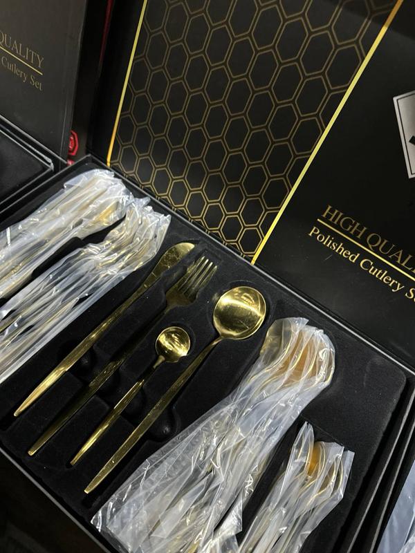 Представляем вам отличный набор столовых приборов – идеальный выбор для вашей стильной и современной сервировки стола. Этот набор включает 24 предмета, что обеспечат вам полный комплект необходимых приборов для блюдения самых вкусных блюд с комфортом. Особенности товара: Высокое качество материала: Каждый предмет набора изготовлен из полированной нержавеющей стали высокого качества. Это обеспечивает его долговечность, устойчивость к коррозии и сохранение блеска в течение длительного периода использования. Современный дизайн: Набор столовых приборов имеет элегантный и современный дизайн с золотистым покрытием, что добавляет вашему столу шарма и стиля. Комплектация: В наборе находятся 6 вилок, 6 ложек, 6 чайных ложек и 6 столовых ножей - все, что нужно для полноценной сервировки. Легкий в уходе: Материал набора обеспечивает его простоту в уходе. Просто вымойте приборы с мягким мылом и теплой водой, чтобы сохранять их в безупречном состоянии. Набор столовых приборов – это изысканный и практичный вариант для любого стола. Наслаждайтесь качеством и стилем с каждым приемом пищи, оставаясь в центре внимания на любом мероприятии. Добавьте шика своей пищи с набором уже сегодня!