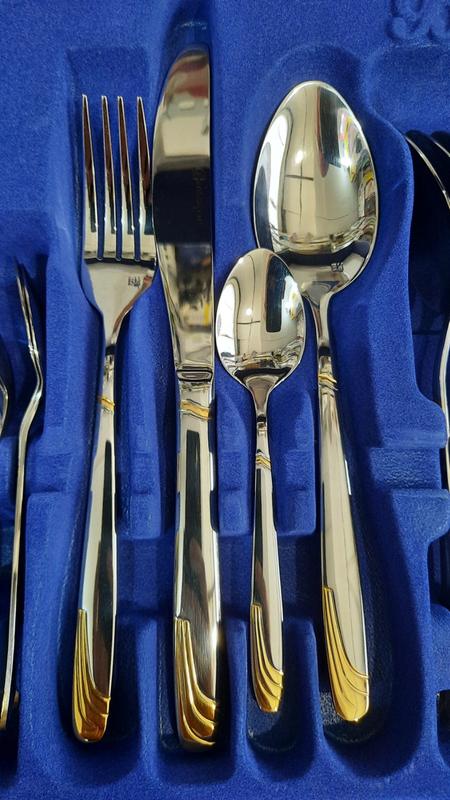 Набор столовых приборов Bachmayer BM 2458 24 Предмета В Наборе Описание: Набор столовых приборов от фирмы Bahmayer. В него входит двадцать четыре предмета для шести персон. Набор столовых приборов Bahmayer Paris-gold из высококачественной нержавеющей стали. Полированная поверхность обладает высокими гигиеническими и антикоррозионными свойствами, не впитывает запахи и легко моется. Ручки приборов имеют матовую полировку с позолоченными вставками по бокам. Красивые столовые приборы добавят шарма и изысканности Вашего праздничного ужина. Комплектация: - Ложка 6 шт - Вилка 6 штук - Маленькая ложка 6 шт - Нож 6 шт