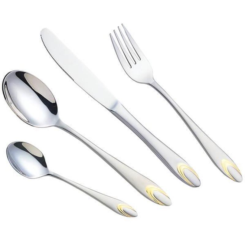 Набор столовых приборов Maestro рассчитан на 6 персон. Выполнен из высококачественной пищевой нержавеющей стали. Изделия из стали отличаются прочностью и долговечностью. Они не подвержены коррозии и воздействию кислот. Данный комплект соответствуют всем гигиеничным нормам и требованиям, а также прост в уходе. Ручки приборов имеют комбинированную полировку и вставки золотого цвета. Это смотрится очень стильно. Такие столовые инструменты станут изюминкой любого праздничного стола. Набор состоит из: - Столовая ложка - 6 шт. - Столовая вилка - 6 шт. - Столовый нож - 6 шт. - Чайная ложка - 6 шт.
