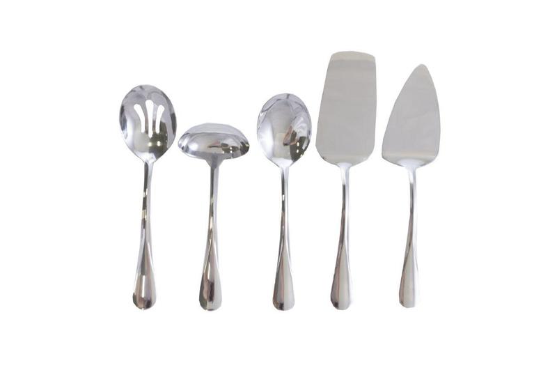 Этот набор состоит из следующих предметов: Лопатка для салатов и лазаньи, Лопатка для пирогов и пирожных, Сервировочная ложка, Сервировочная ложка с прорезями, Половник/