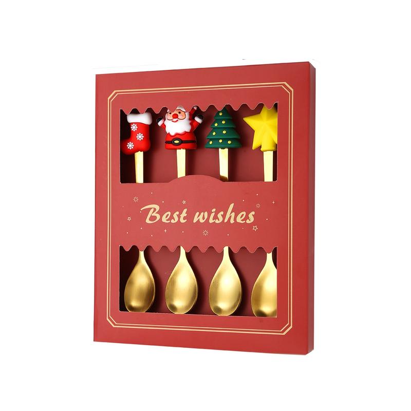 Новорічний набір столових приборів - чудовий вибір для прикрашання святкового столу та додавання особливого настрою гостям. Дизайн відрізняється елегантністю з тематичними елементами, що додають особливого шарму. В наборі 4 ложечки. Колір - золотистий Довжина - 15 см. Розмір коробки: 19х15х2 см