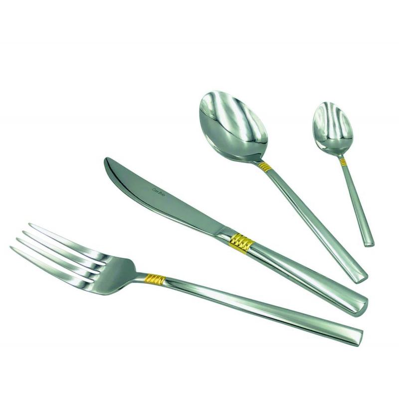 Набор столовых приборов Con Brio выполнены из нержавеющей стали с глюцевой полировокой. Сталь является прочным и долговечным материалом, поэтому посуда прослужит Вам долгое время и сохранит привлекательный внешний вид. Она гарантированно прослужит длительный период, при этом сохранит презентабельный вид. Также не придает пище дополнительный привкус и запах. Характеристика: Тип: набор столовых приборов Материал: нержавеющая сталь 24 предмети Глянцевая полировка На ручке узор под золото Цвет: серебристый Состав набора: столовая ложка: 6 шт Столова вилка: 6 шт Столовый нож: 6 шт Чайна ложка: 6 шт