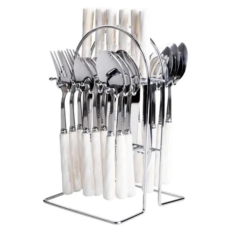 Набор столовых приборов на подставке 24 предмета с керамическими ручками, серебристый