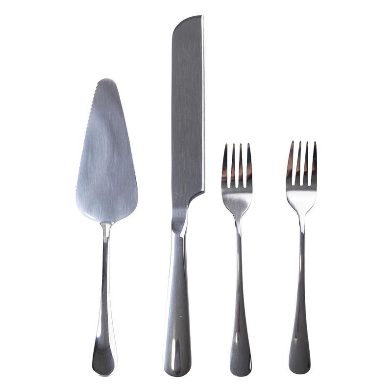 Набор столовых приборов для подачи тортов серебристый состоит из четырех предметов: лопатки, ножа и двух вилок. Все элементы изготовлены из нержавеющей стали, что обеспечивает их долговечность и устойчивость к коррозии. Гладкая поверхность приборов способствует легкой очистке и предотвращает образование пятен. Основные характеристики: Количество предметов: 4; Материал: нержавеющая: сталь. Длина приборов: лопатка: 23 см; вилка 2 шт.: 17.5 см; нож: 27 см. Лопатка имеет удобную форму с заостренным краем, что облегчает подачу торта. Нож предназначен для точной нарезки десертов. Благодаря простому дизайну набор подходит как для домашнего использования, так и для праздничных мероприятий. Приборы выполнены в серебристом цвете без лишних декоративных элементов. Это позволяет сочетать их с различными стилями сервировки стола. Набор пригоден для мытья в посудомоечной машине в соответствии с рекомендациями производителя.