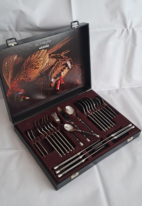 Exclusiv-Modell Sir Christopher WILKENS". Производитель: WILKENS, немецкий бренд известен производством высококачественных столовых приборов. Модель: "Sir Christopher", эксклюзивная модель, ограниченный выпуск и особенный дизайн. Материал: изготовлен из нержавеющей стали (например, 18/10), что является стандартом для качественных столовых приборов. Комплектация: Нержавеющая сталь, ковальная, ручки из пластика, с заклепками. Набор включает в себя различные столовые приборы, такие как вилки, ножи, ложки, что делает его полноценным сервизом.