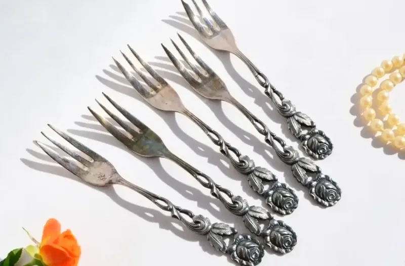 Чудовий набір десертних виделок, 5 штук, дизайн «Хільдесхаймська троянда». Німеччина. Срібне покриття. Всесвітньо відомий дизайн Хільдесхаймська троянда, геніально гарна річ – "Тисячолітня троянда Хільдесхайма". Предмети виконані у старій традиції німецьких майстрів, дуже гарна ручна робота. Стан прекрасний, з незначними слідами часу є природна шляхетна патина. Сріблення в чудовому стані. Прикрасять будь-яке чаювання та доповнять колекцію.🌺