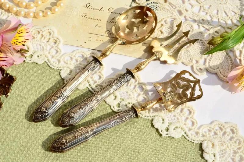 Удивительная красота набор для сервировки стола и подачи закусок и десертов с серебряными. Франция, начало XX века. Каждый предмет имеет клеймо Minerva. Лопатки изготовлены из латуни и покрыты золотом. Серебряные ручки украшены изысканными узорами в неоклассическом стиле. Это редкое и очень красивое изделие, которое представляет настоящий французский антиквариат для привередливых коллекционеров. Он в отличном состоянии с незначительными следами времени.