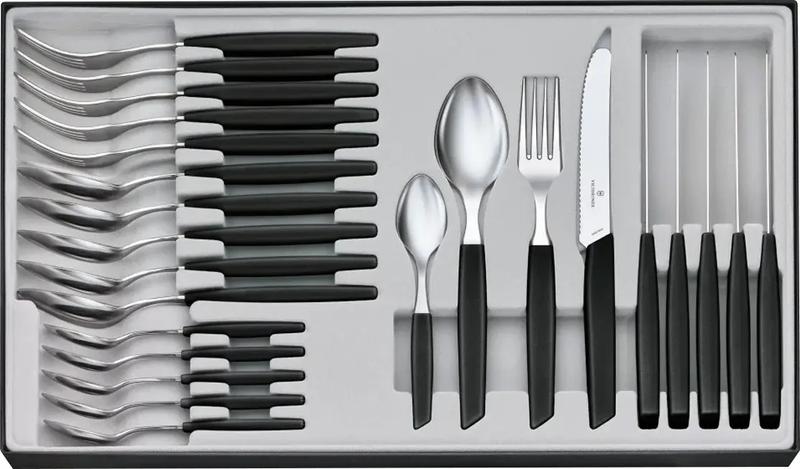 Набор столовых приборов Swiss Modern Table Set от швейцарского бренда Victorinox идеально дополнит любой стол своим минималистичным, но стильным дизайном и подойдет для ваших посиделок в кругу друзей или семьи. Ручки столовых приборов изготовлены из высококачественного полипропилена. Это делает столовые приборы очень легкими и приятным на ощупь. Эргономичные рукоятки не скользят, что также является большим плюсом. Лезвия ножей изготовлены из нержавеющей стали и имеют серейторную кромку, которая является универсальной и подходит для нарезки мяса, рыбы, овощей, фруктов, сэндвичей и др. Расширенные наборы включают в себя столовые и чайные ложки, которые как и вилки, изготовлены из комбинации полипропилена и нержавеющей стали, поэтому весь набор подходит для мытья в посудомоечной машине. Наборы Swiss Modern Table Set доступны в нескольких цветах, поэтому каждый сможет подобрать набор, который подойдет к его столу.