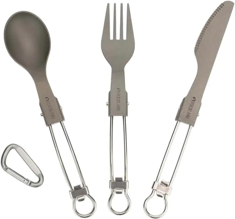 Rockland Titanium Tools - набор столовых предметов, который состоит из ложки, вилки, ножа и карабина, благодаря которому удобно закрепить приборы на лямке рюкзака или кармане. Titanium Tools изготовлен из легкого но сверхпрочного титана и имеет механизм складывания приборов пополам, что значительно экономит место в кармане или рюкзаке. Универсальный компактный набор для путешественников, которым важны размер и вес снаряжения.