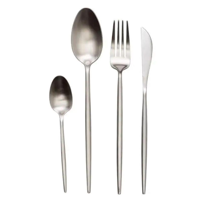 Набор столовых приборов серебристого цвета состоит из 24 предметов: 6 столовых ложек, 6 чайных ложек, 6 вилок и 6 столовых ножей. Каждый предмет имеет классический дизайн без лишних декоративных элементов, что делает их универсальными для ежедневного использования или сервировки праздничного стола. Столовые приборы имеют гладкую полированную поверхность, которая легко очищается и не задерживает загрязнения. Основные характеристики: Количество предметов в наборе: 24 шт.; Количество персон: 6; Материал: нержавеющая сталь; Упаковка: коробка; Размеры приборов: длина столового ножа: 21.5 см; длина столовой ложки: 22.5 см; длина столовой вилки: 22 см; длина чайной ложки: 14.5 см. Комплектация набора: столовый нож: 6 шт.; столовая ложка: 6 шт.; столовая вилка: 6 шт.; чайная ложка: 6 шт.. Материал изготовления - нержавеющая сталь, которая отличается прочностью, устойчивостью к коррозии и долговечностью. Лезвия ножей имеют заточенную кромку, что обеспечивает удобное нарезание продуктов. Вилки и ложки имеют эргономичную форму, что способствует комфортному удержанию в руке во время приема пищи. Все предметы набора можно мыть в посудомоечной машине без риска потери блеска или повреждения поверхности. Комплект поставляется в базовой упаковке, которая защищает приборы от механических повреждений во время транспортировки. Набор подходит для использования в домашних условиях, заведениях общественного питания или как вариант для временного жилья. Благодаря стандартным размерам и нейтральному дизайну эти столовые приборы легко сочетаются с различными стилями посуды и текстиля для сервировки стола.